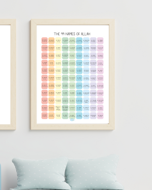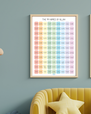 Introduce your child to the beauty and significance of the 99 Names of Allah with this colourful and meaningful print. Designed with children in mind, this print features all the beautiful names in a colourful and engaging style, helping young minds connect with the divine attributes of Allah in a fun, educational way. Perfect for any nursery, bedroom, or playroom, this print will inspire faith, reflection, and a deeper understanding of Islamic teachings.